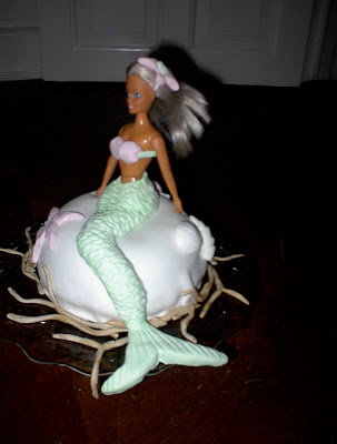 Jeg har brugt en halv Barbie dukke med en pind i underdelen i stedet for ben. Dukken er stukket direkte ned i kagen, og så har jeg modeleret en havfruehale i fondant.